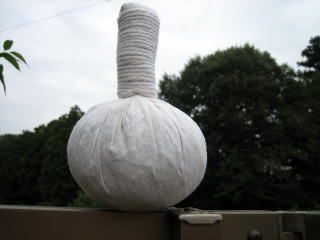 ハーブを細かく粉砕し粉状にして泥を混ぜて布に包みました。